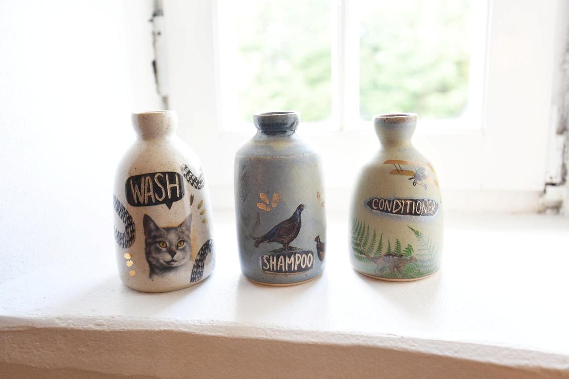 Local maker Claire Henry was commissioned to create her bespoke ceramics for the bathrooms. Stef and Simon intend to refill these unique ceramic pots with eco-friendly Faith In Nature products for guests to use.