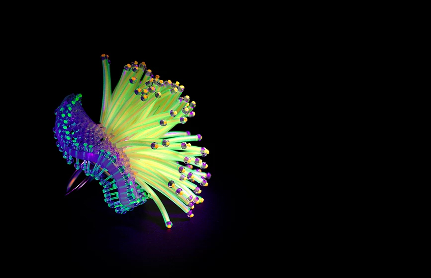 Congratulations to Scottish-based maker Wanshu Li, who has won the JOYA Award 2017 at the Barcelona Art Jewellery Fair in October 2018. For her final graduate collection at the Edinburgh College of Art's (ECA) jewellery and silversmithing department, Wanshu Li created a multisensory jewellery collection called Go with the Glow. Inspired by marine life, particularly jellyfish, her pieces feature tactile moving parts with fluorescent and UV properties.