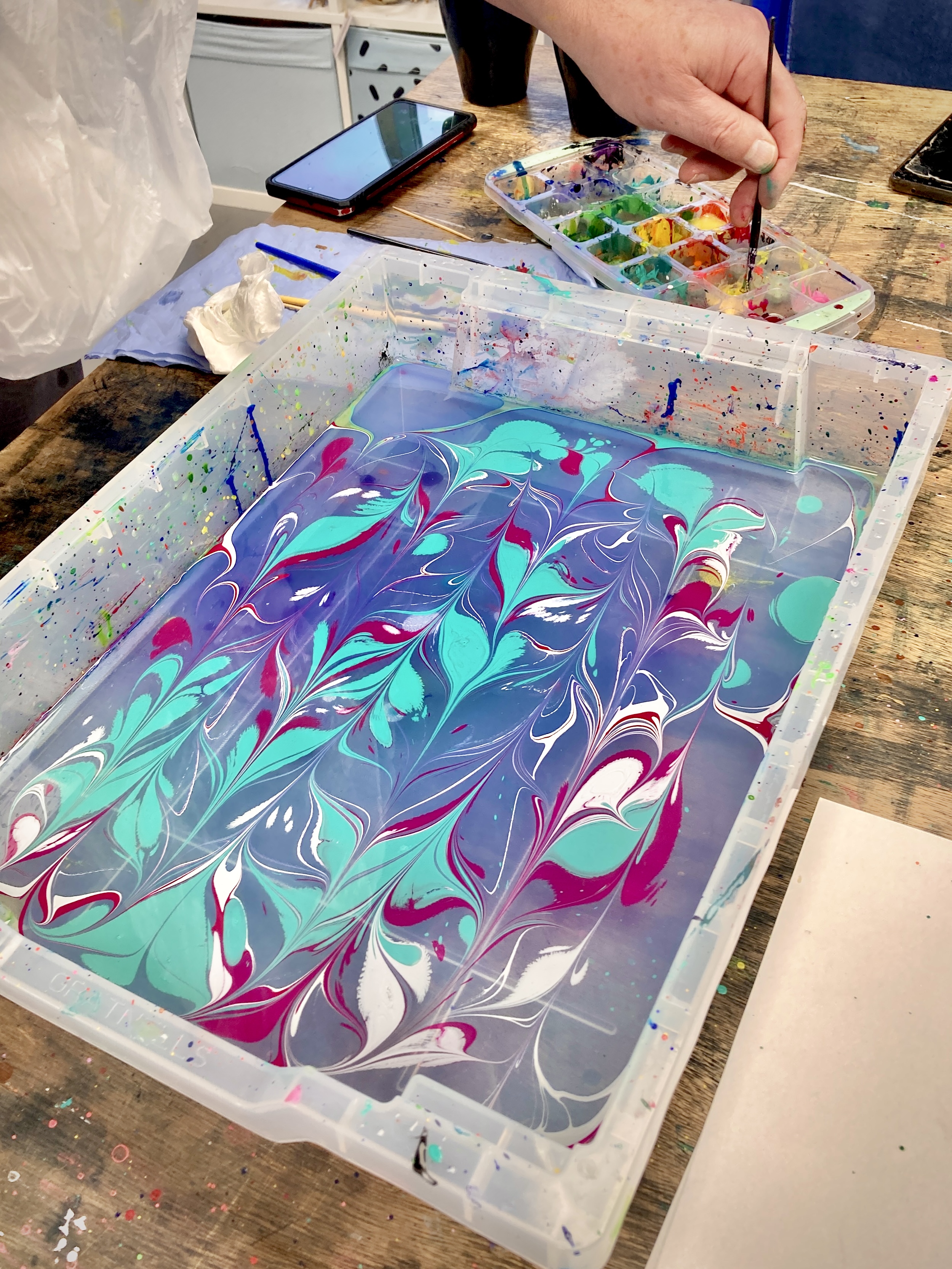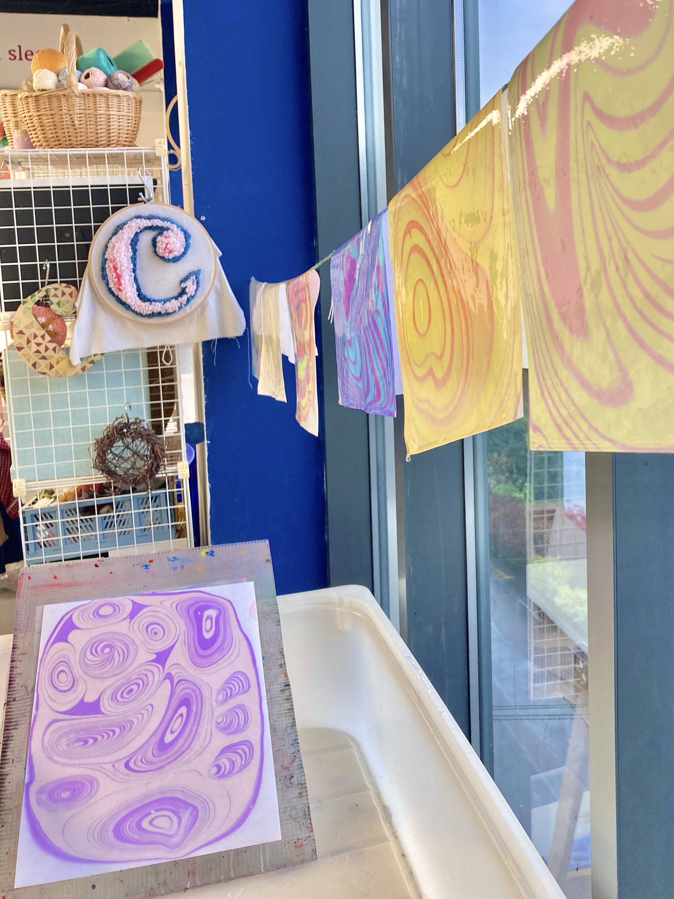 Shona will teach you traditional marbling techniques using a specially prepared thickened water bath and high quality acrylic inks. We will experiment with different methods of application using brushes, droppers and handmade tools, allowing you to play with patterns and colour. With a wide range of colours available, you’ll have the opportunity to experiment with various styles – whether you’re drawn to bold, groovy designs or soft, pastel patterns. You’ll have the freedom to explore your own creative ideas, guided by Shona’s expert support.