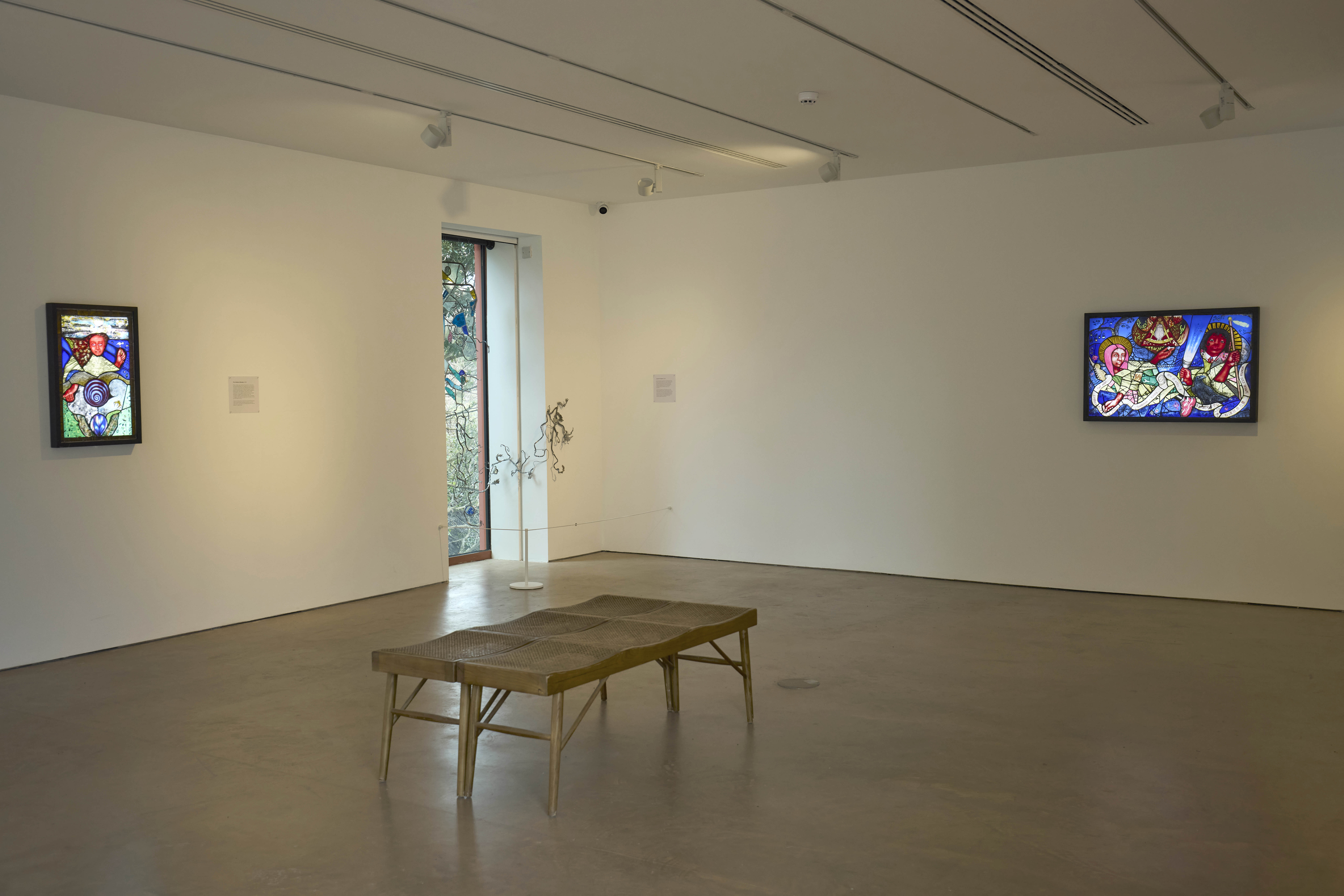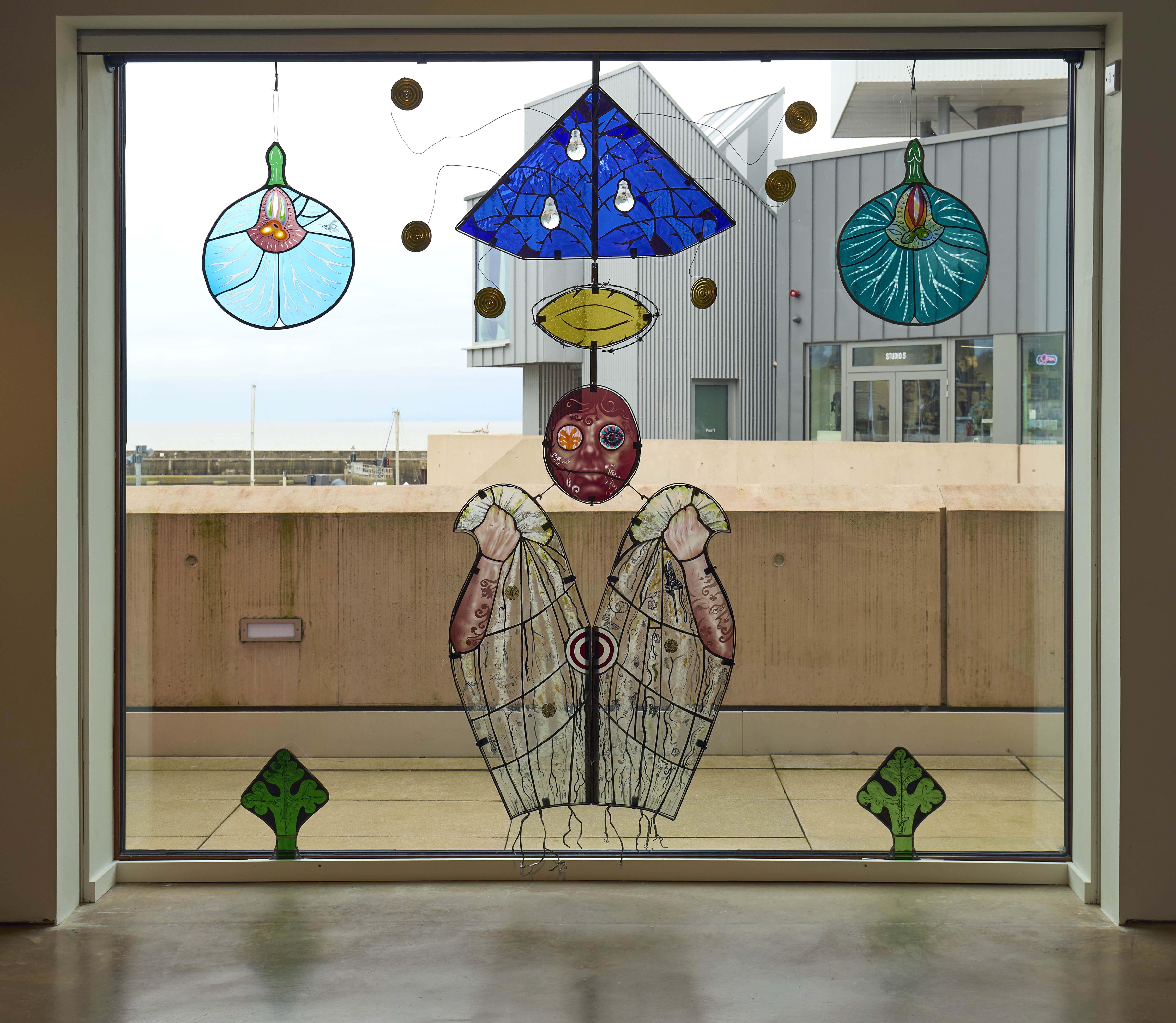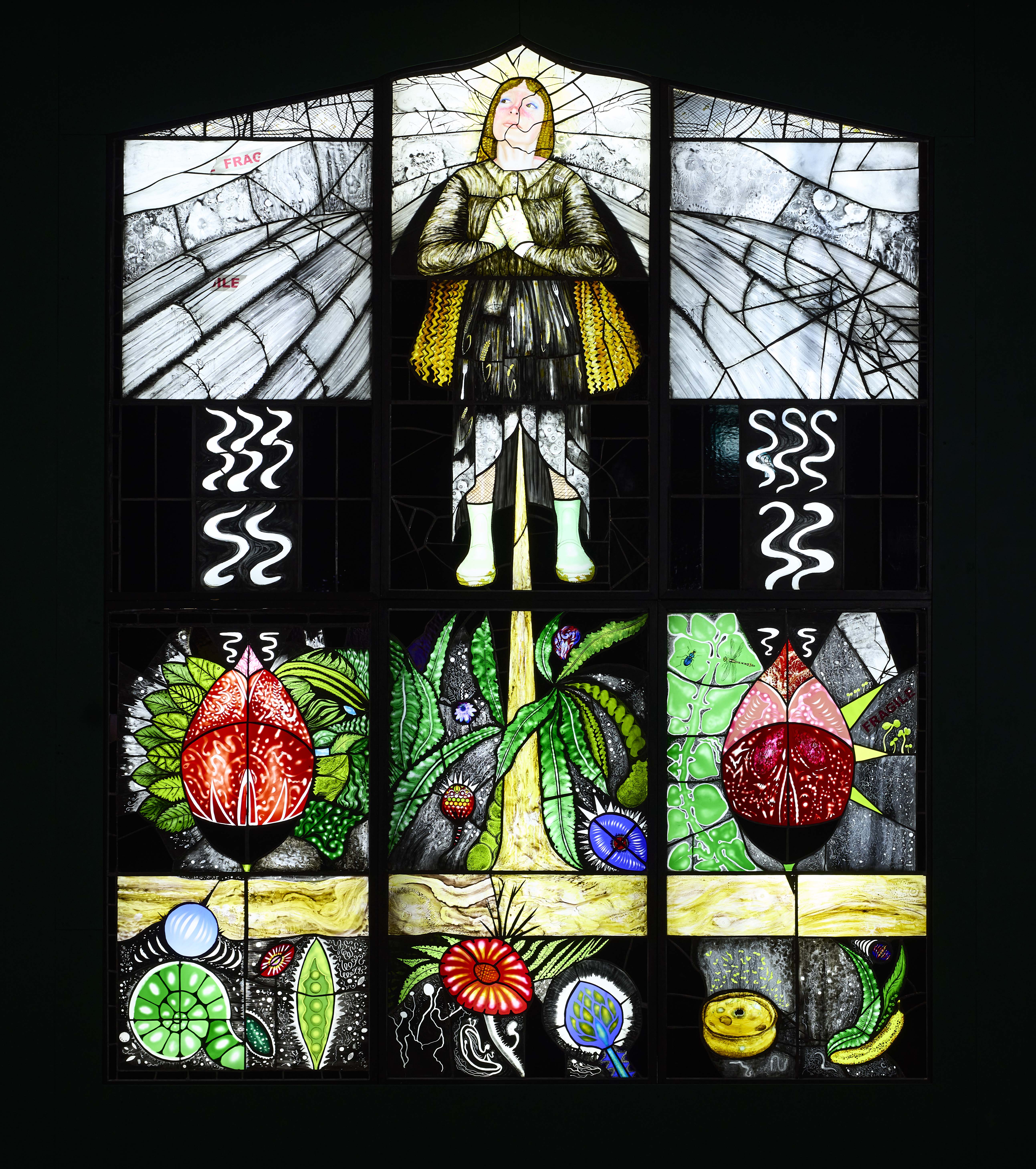 Earthly Spirits was inspired by a visit to the Church of the Holy Ghost in Crowcombe, Somerset, where Maclure found pagan imagery, such as a Green Man, in a Christian setting. She also noticed a boy learning to play the piano there, while a twittering swallow circled above his head. These unlikely coexistences prompted the question: What is sacred? Is the Earth itself sacred? Using Christian and pagan symbolism, Maclure's work subverts traditional stained glass to celebrate nature and the spirit of rebellious optimism through grassroots environmental activism.