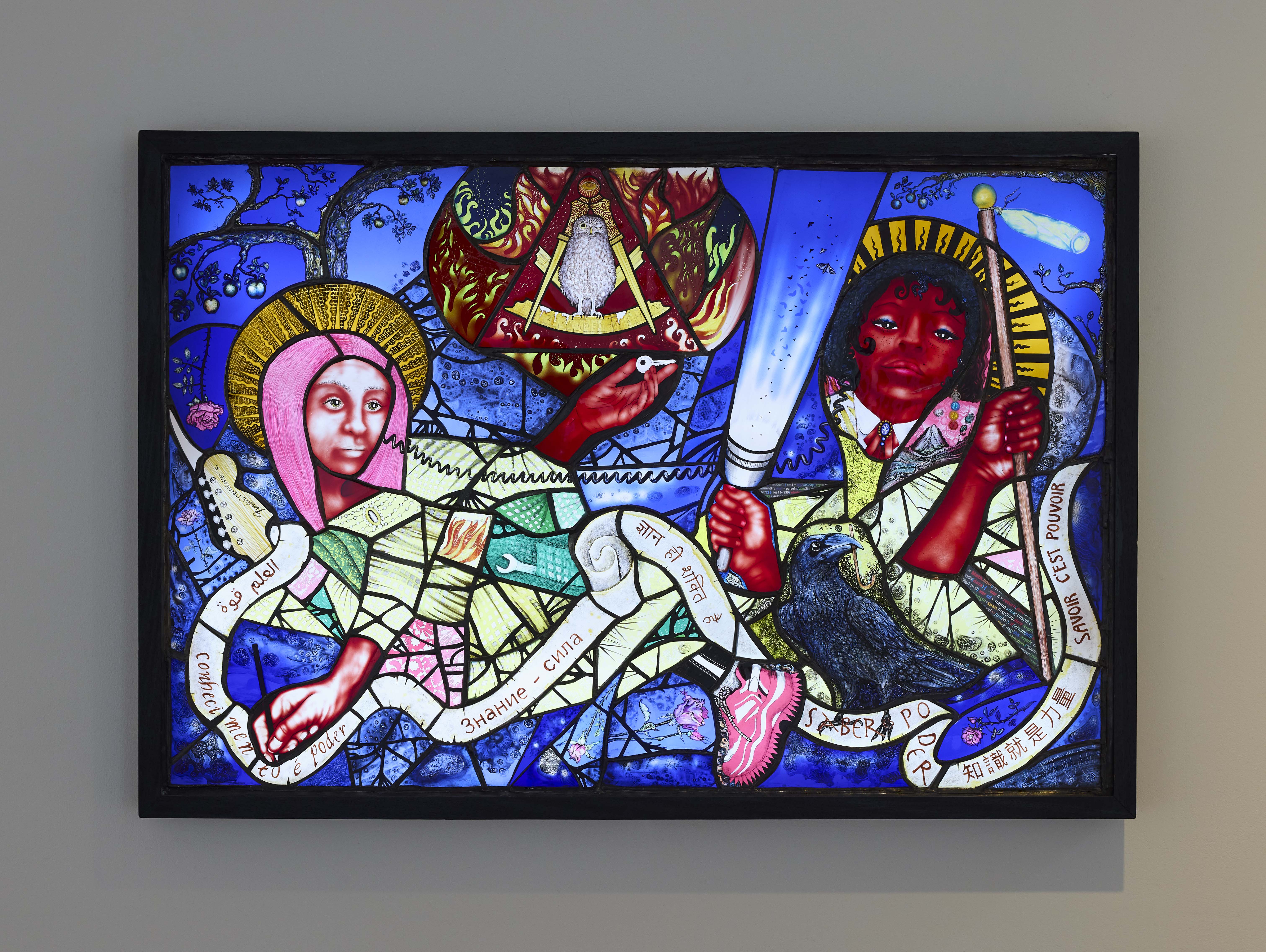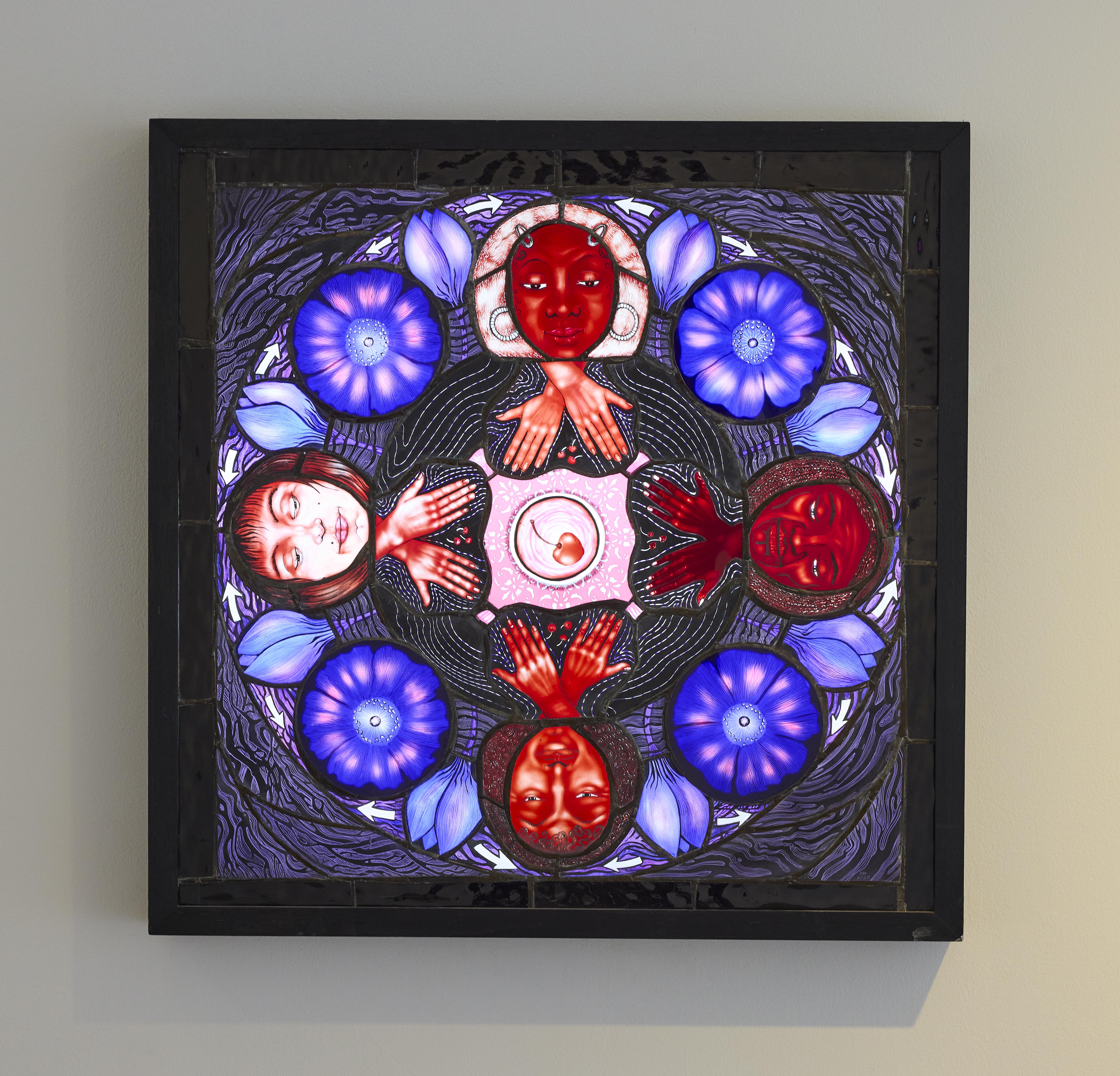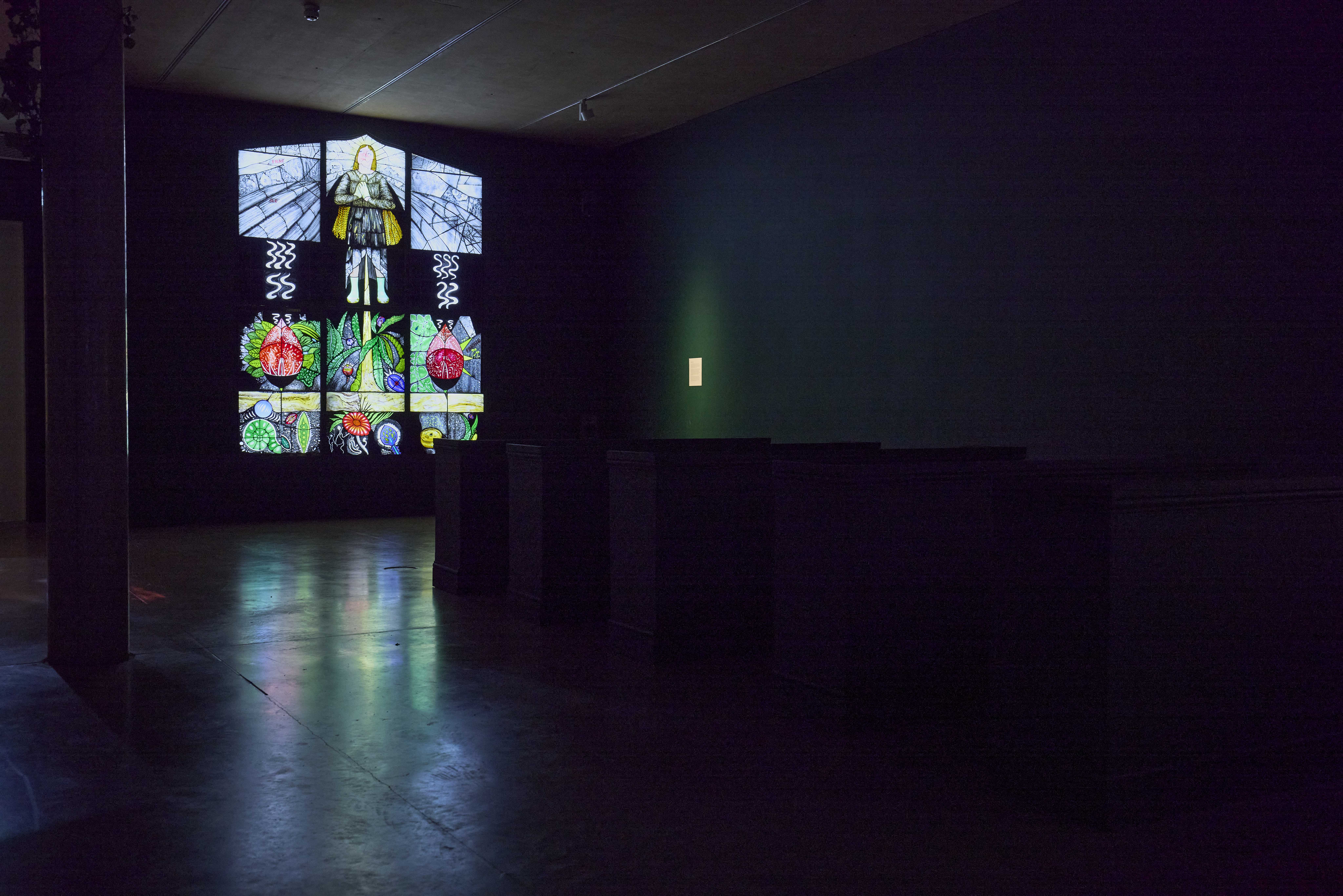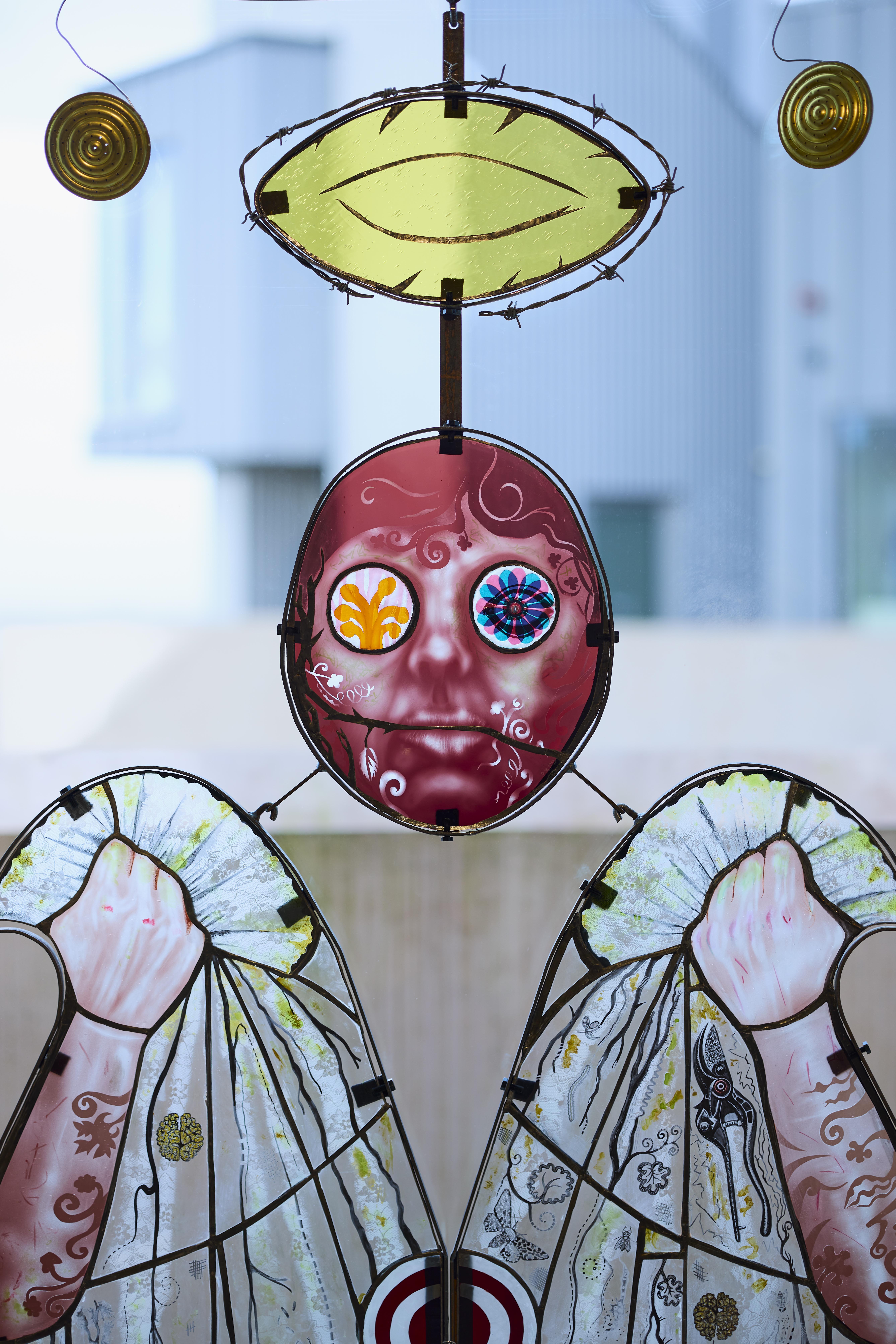 Earthly Spirits was inspired by a visit to the Church of the Holy Ghost in Crowcombe, Somerset, where Maclure found pagan imagery, such as a Green Man, in a Christian setting. She also noticed a boy learning to play the piano there, while a twittering swallow circled above his head. These unlikely coexistences prompted the question: What is sacred? Is the Earth itself sacred? Using Christian and pagan symbolism, Maclure's work subverts traditional stained glass to celebrate nature and the spirit of rebellious optimism through grassroots environmental activism.